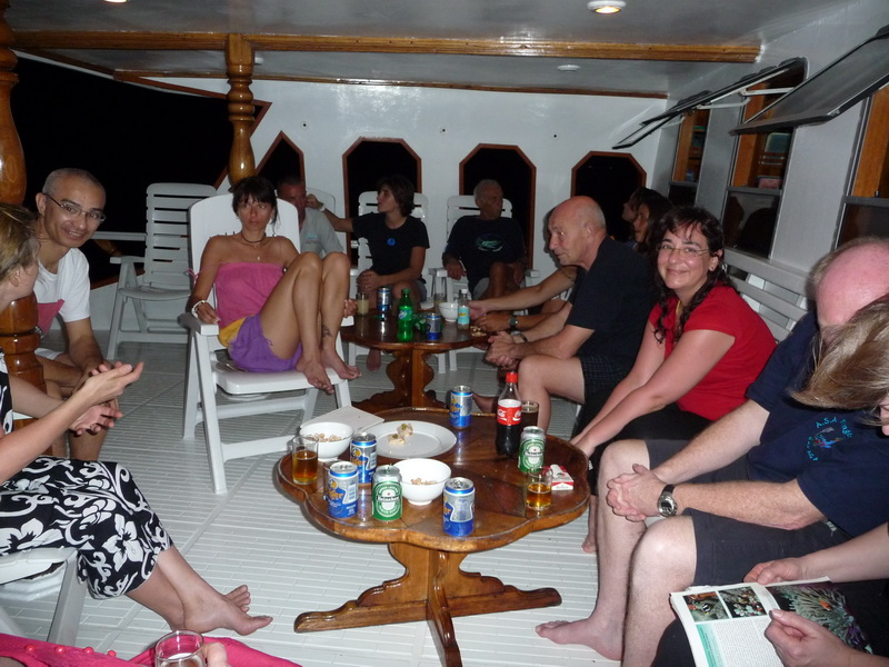 La vie à bord est rythmée par les trois plongées par jour : lever à l'aube, petit café et biscuits puis 1ère plongée vers 8h30. Retour à bord et petit déjeuner copieux, puis 2ème plongée en fin de matinée. Repas de midi - préparé par l'excellent cuistot sri-lankais - puis 3ème plongée dans l'après-midi. Et bien sûr le petit apéro avant le dîner. Le bateau navigue de site en site en journée : la nuit se passe toujours à l'abri.