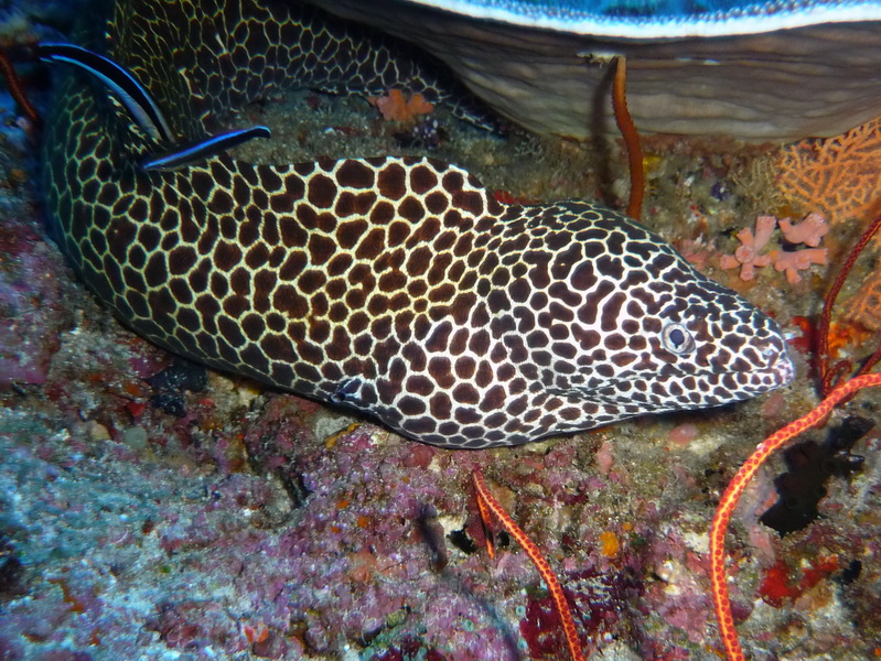 Deux plongées absolument inoubliables : 45 min de nuit, assis sur un fond de sable à voir les mantas se gaver de plancton en faisant des loopings devant nous et nous frôlant (voire plus !!). Puis le dernier jour, sur Rasdhoo Atoll, un marteau dans le bleu puis à la remontée, ballet de 8 requins gris juste devant nous, devant le récif. Plus bien sûr (mais ce n'est pas une plongée !!) la rencontre avec le requin baleine en PMT, après l'avoir cherché un moment, le bateau faisant des allers-retours dans la zone où il pouvait se trouver.